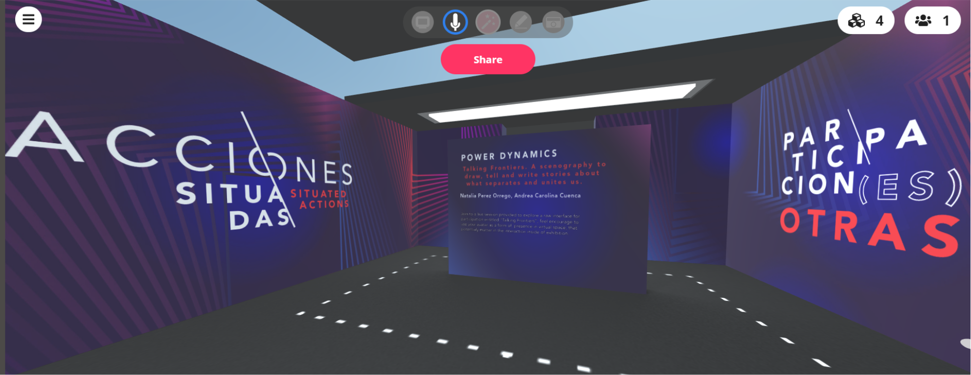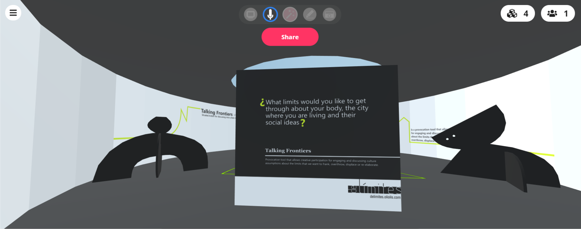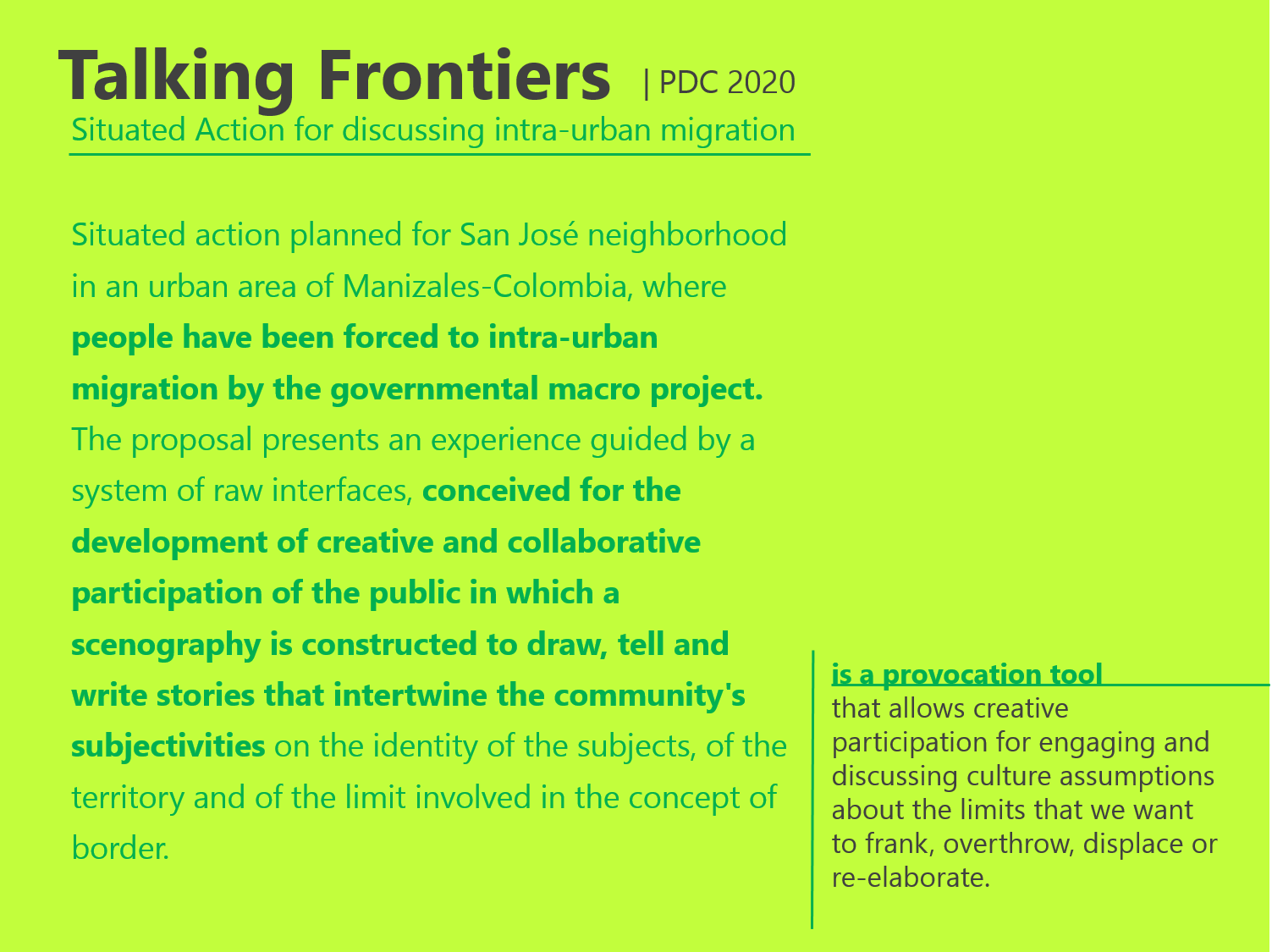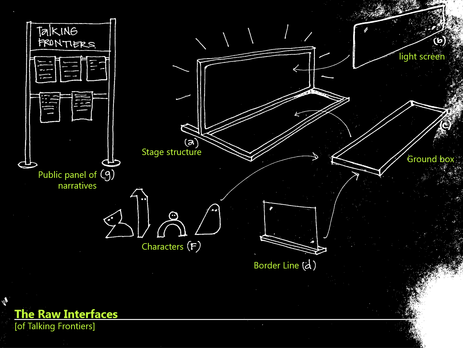 Estos laboratorios son guiados por un sistema de interfaces crudas, concebidas para el desarrollo de una participación creativa y colaborativa del público en la que se construye una escenografía para dibujar, contar, fundir, y escribir historias que entrelazan las subjetividades de la comunidad sobre la identidad de los sujetos, del territorio y del límite involucrados en el concepto de frontera. Esta discusión ciudadana puede ser provocada desde 3 diferentes participaciones creativas: reconocer, cruzar y revocar la frontera.